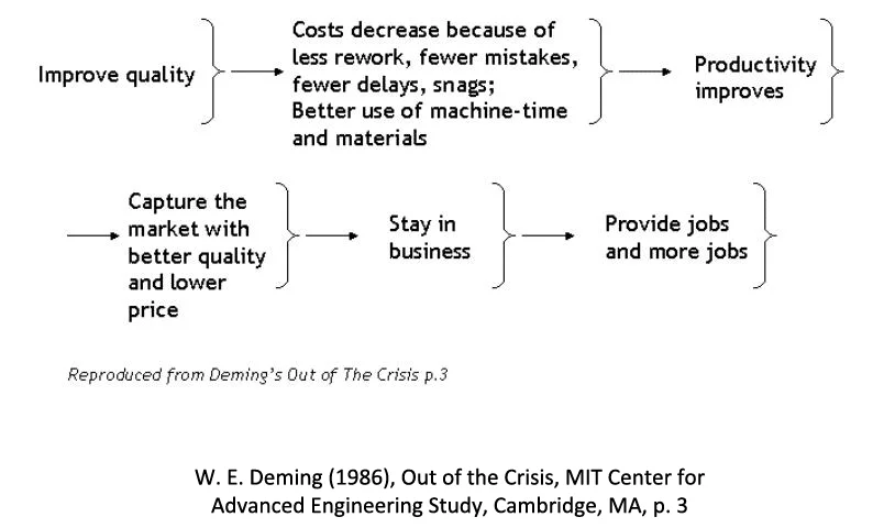 W.E. Deming described a chain reaction in his 1950 JUSE lectures: Start with improved quality, end up with more jobs—a useful reminder today as almost all advanced economies seem to struggle with creating meaningful work for citizens.