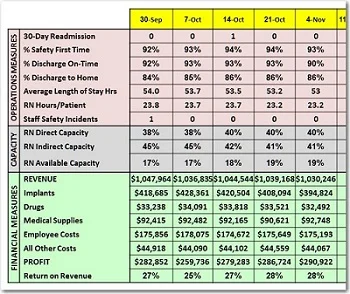 In Brian’s view, the Box Score is the fundamental measurement tool for value stream management. The table below is an excerpt from a Box Score developed for an elective hip and knee replacement value stream.