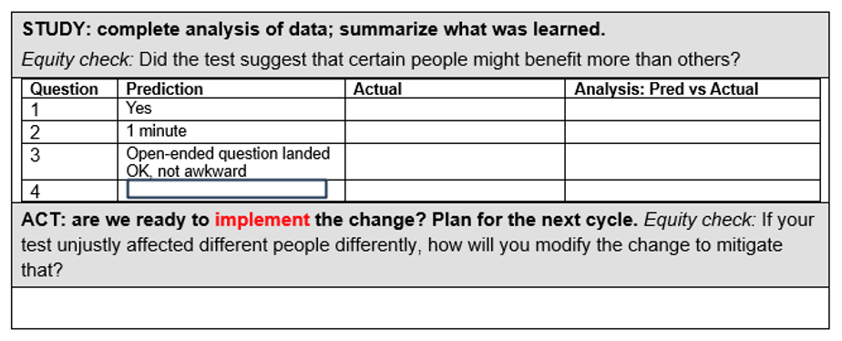 The long-term benefit: Practicing the PDSA discipline makes the PDSA steps more and more automatic. You can quickly run through the steps in new applications and under stress. You’re ready to learn efficiently and effectively in a range of situations.