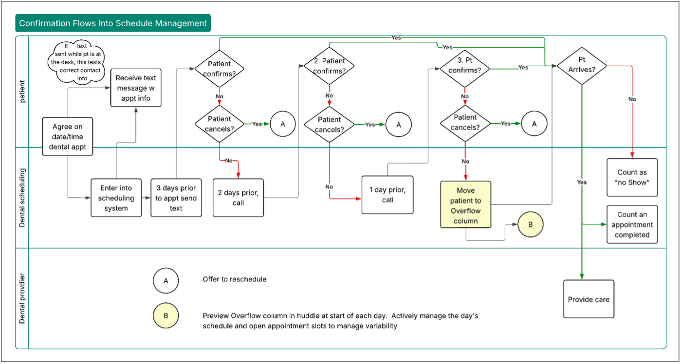 Wood River still has days with multiple wasted appointments across the dental schedule. However, their system now has a clear aim: to maximize appointment slots, not just to report no-show data every month, which seemed an insoluble problem. The system makes the opportunities visible, gives Helen and her team a method for managing schedule variations, and provides a foundation for testing additional interventions.